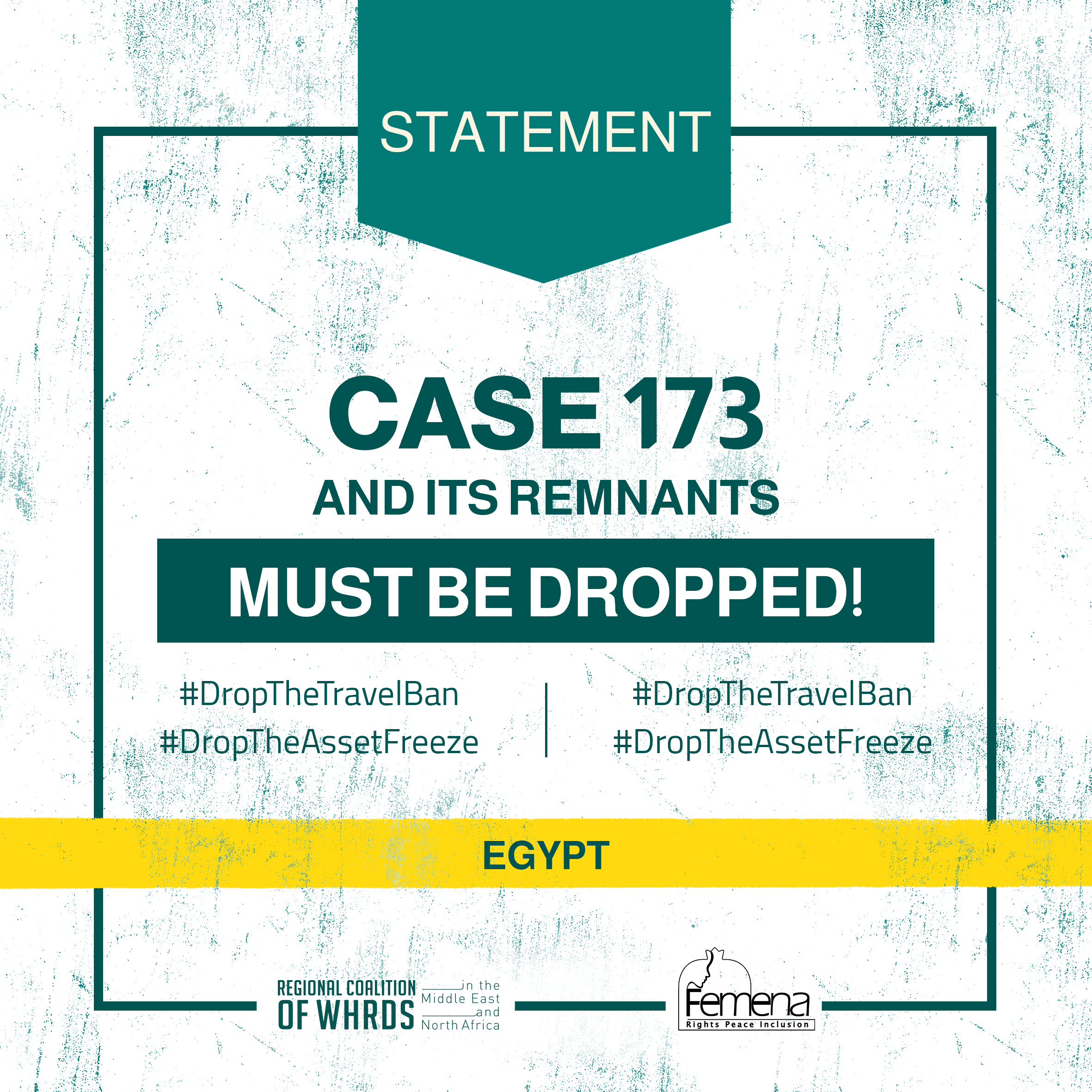 The undersigned, representing regional and international feminist, women’s rights and human rights, organizations, call on the Egyptian state to immediately drop the charges and lift any travel bans and asset freezes against all those still prosecuted in Case 173 including Magda Adly, Suzanne Fayyad, and Aida Seif ElDawla. We also call on the Egyptian judiciary to immediately lift the travel ban and asset freeze against Azza Soliman and her law firm.