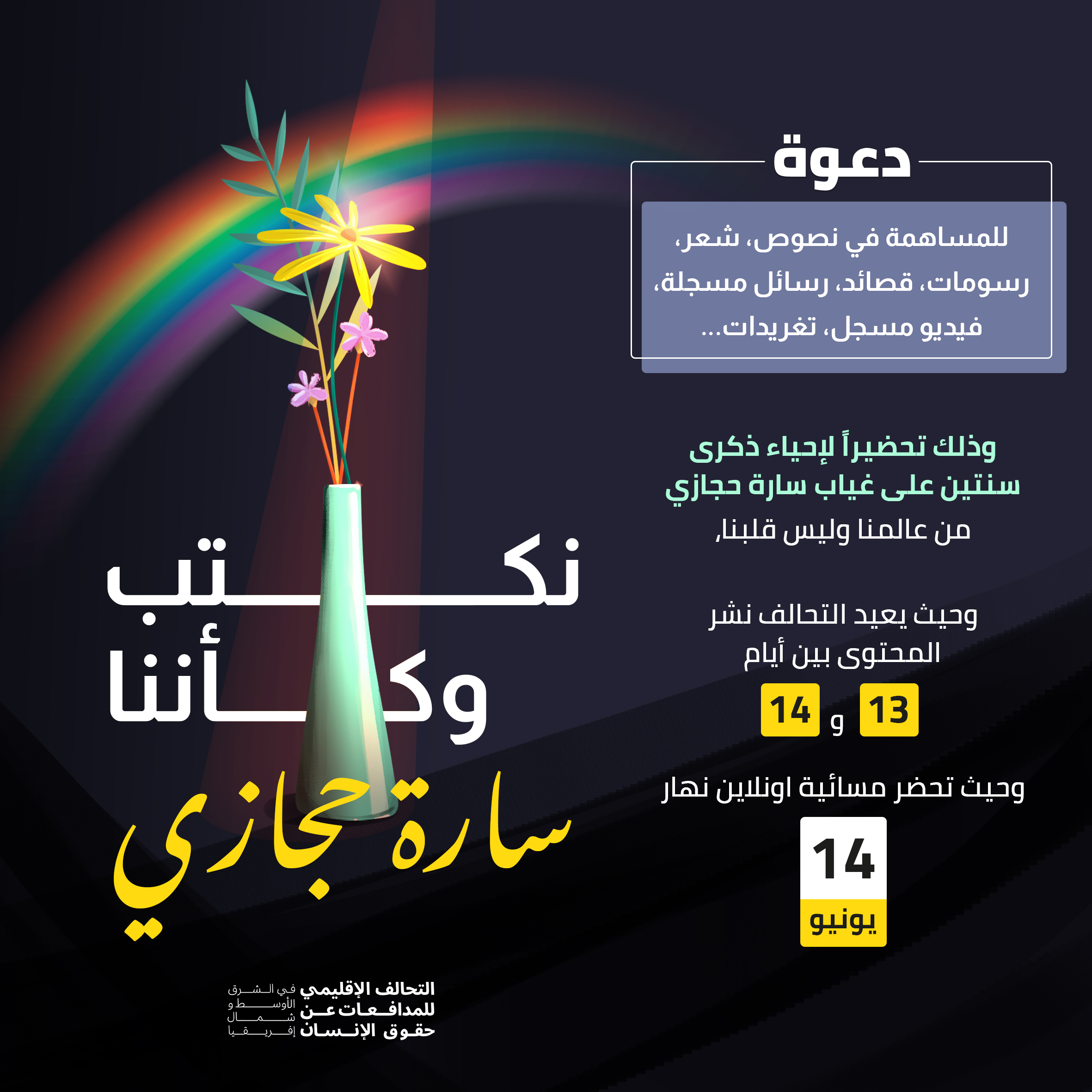 بناء على الحوار، قررّ التحالف دعم الأصدقاء من المجتمع الكويري، وخصوصا أصدقاء سارة حجازي، وإحياء الذكرى الثانية لغيابها عن عالمنا وليس قلبنا وذلك من خلال تشجيع تفاعل يمتد على مدى يومين، تحت عنوان “نكتب وكأننا سارة حجازي” وحيث صمم أصدقاء ورفاقها النص التالي لدعوتنا جميعا لإحياء ذكراها.