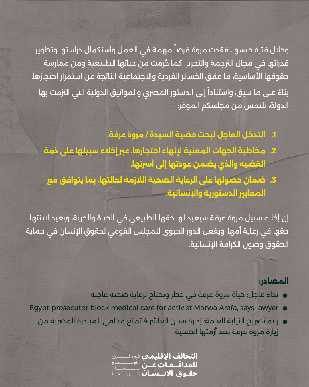 وعليه، نلتمس من مجلسكم الموقر التدخل العاجل لبحث هذه القضية، ومطالبة الجهات المعنية بإنهاء احتجاز السيدة / مروة عرفة عبر إخلاء سبيلها على ذمة القضية وخاصة لظروفها الصحية الخطيرة والمهددة لحياتها، حفاظاً على حقها في الحياة والكرامة، وتجسيداً لدور المجلس في صون حقوق الإنسان في مصر.