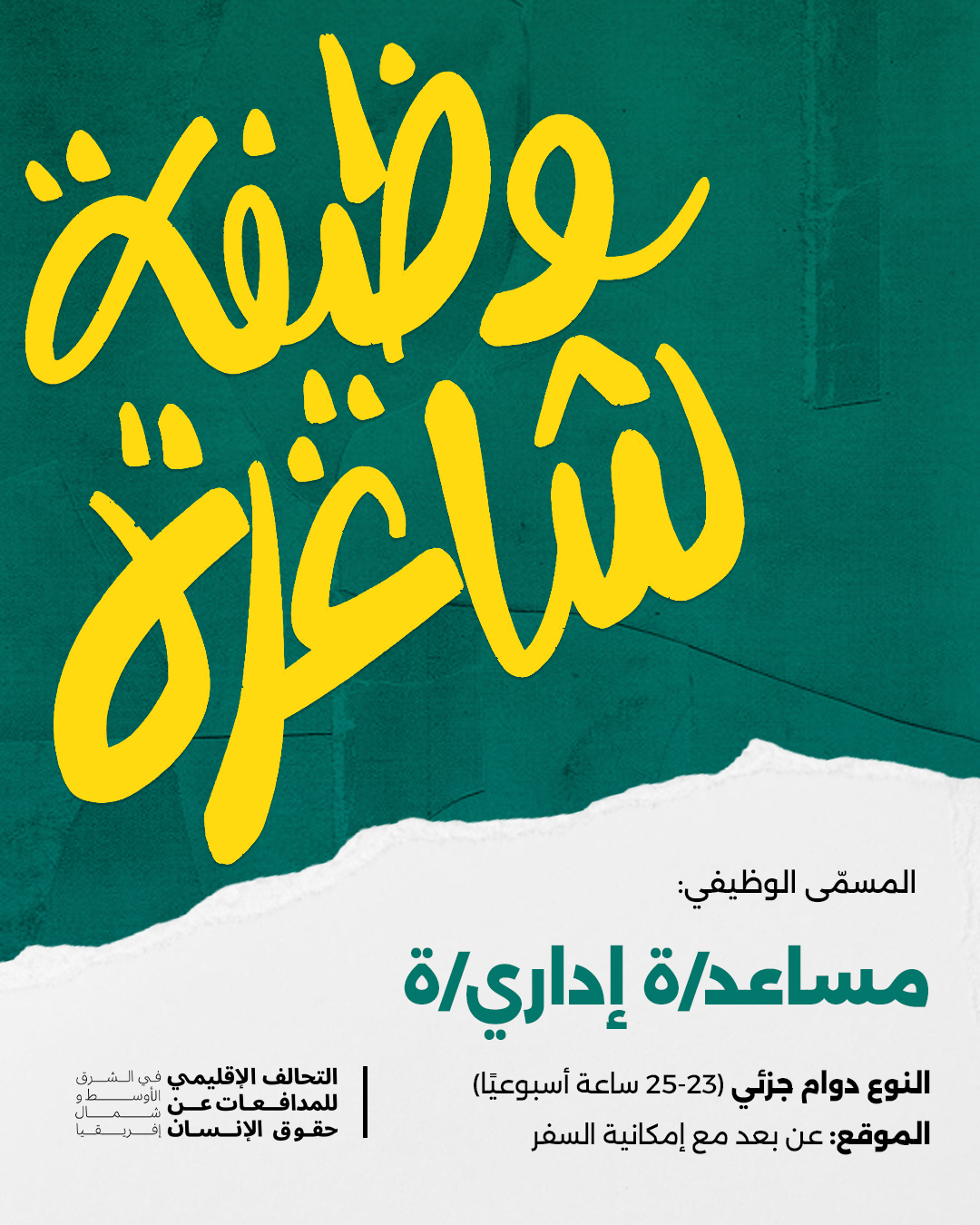 يبحث التحالف الإقليمي عن المدافعات عن حقوق الانسان في جنوب غرب أسيا وشمال أفريقيا للتعاون مع شخص من منطقة سوانا (جنوب غرب آسيا وشمال أفريقيا) لشغل منصب مساعد إداري. سيقدم المساعد الإداري دعمًا إداريًا شاملاً للفريق، لضمان سير العمليات بسلاسة، وتوثيقها بشكل صحيح. يتطلب المنصب مهارات تنظيميّة عالية والقدرة على العمل بشكل مستقلّ وإيجابي.