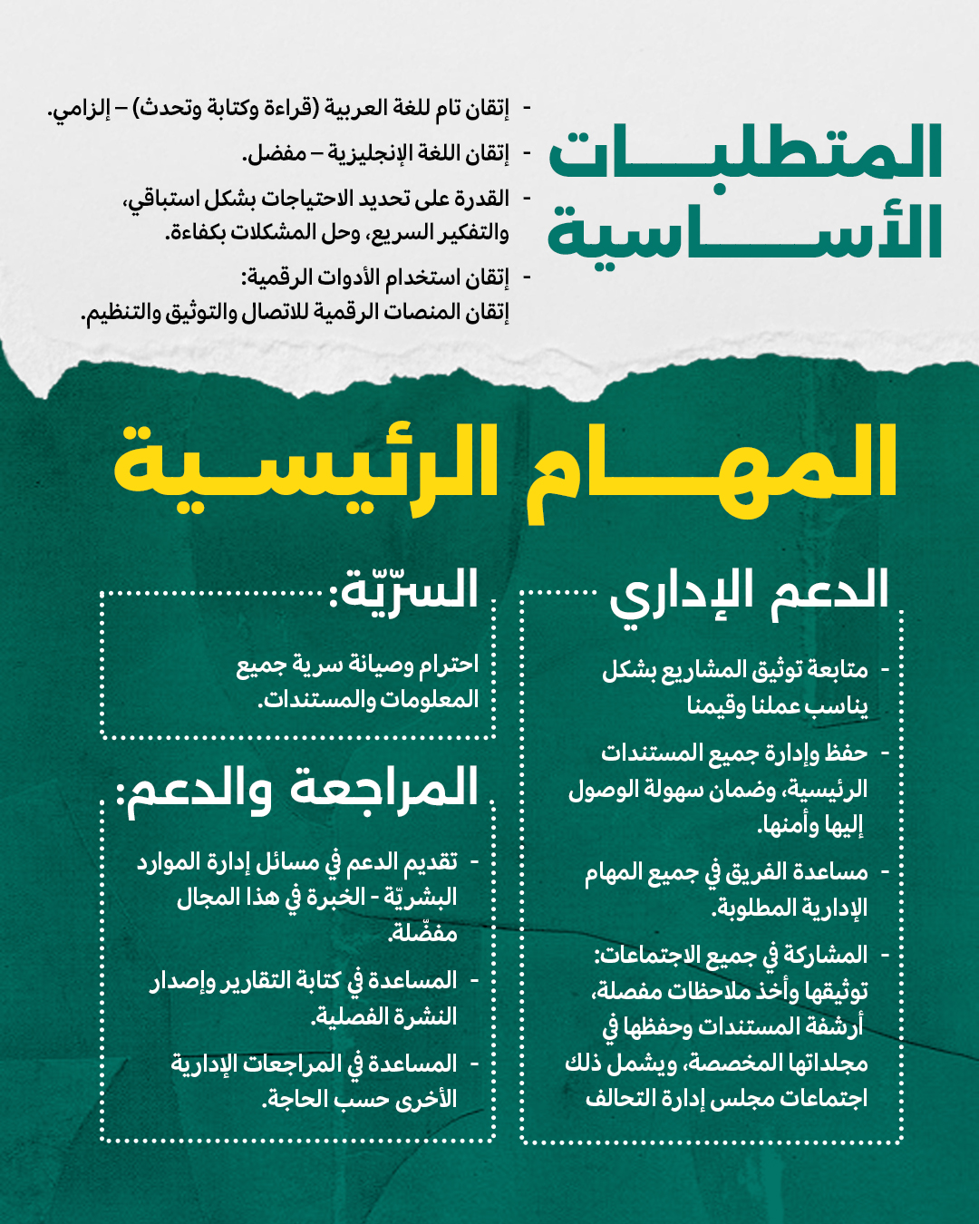 • مساعدة الفريق في جميع المهام الإدارية المطلوبة.