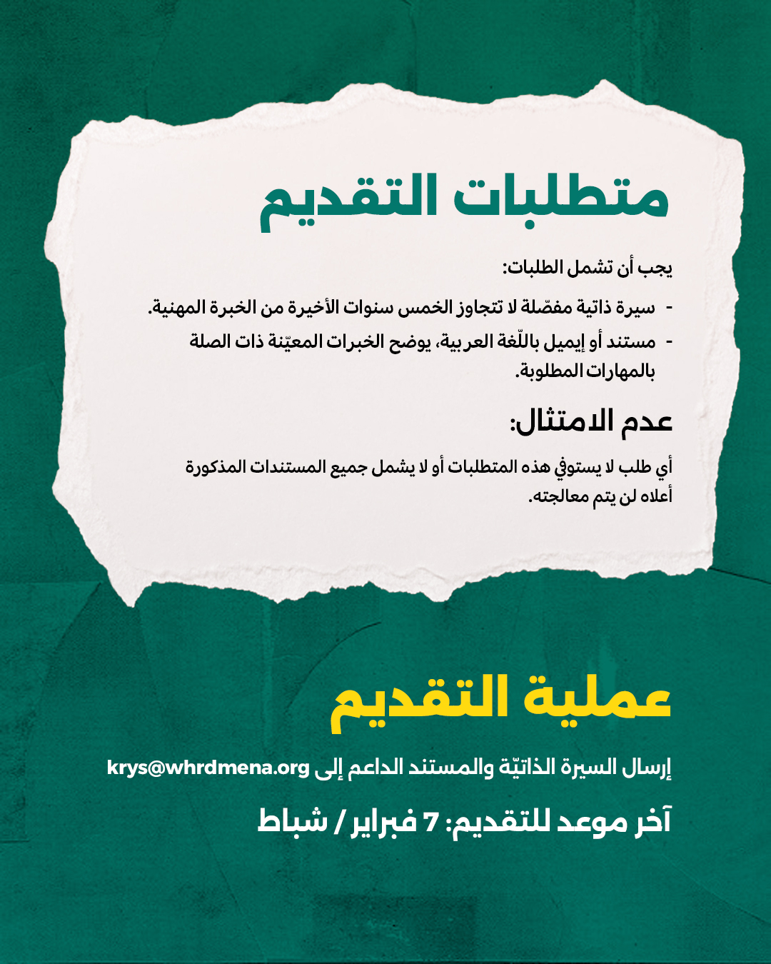 إرسال السيرة الذاتيّة والمستند الداعم إلى krys@whrdmena.org
