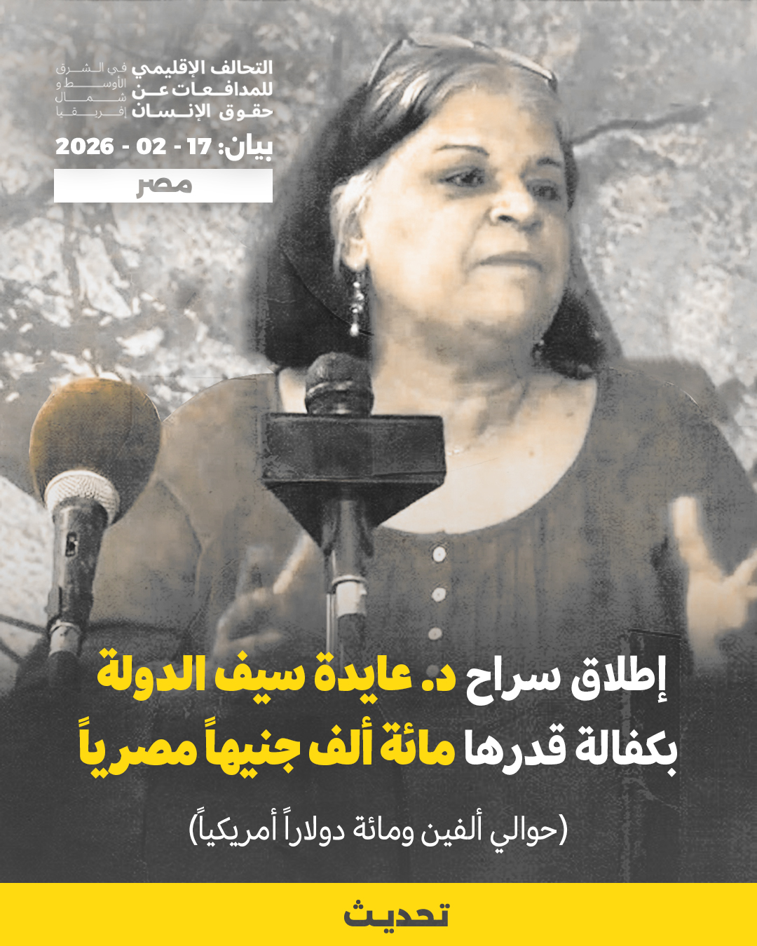 يتضامن التحالف الإقليمي للمدافعات عن حقوق الإنسان في جنوب غرب آسيا وشمال أفريقيا (WHRDMENA) كلياً مع المدافعة عن حقوق الإنسان د. عايدة سيف الدولة ويُقدّر دورها الهام في تسليط الضوء على قضايا المعتقلين والمعتقلات، ومن ضمنهم المترجمة والمدافعة عن حقوق الإنسان مروة عرفة والمحامية والمدافعة عن حقوق الإنسان هدى عبد المنعم، واللتا يعيننّ من ظروف صحية عصيبة ويستمر حبسهن بالرغم من هذه الظروف وبراءتهن من الاتهامات الموجهة لهن والقضايا الملفقة بحقهن.
