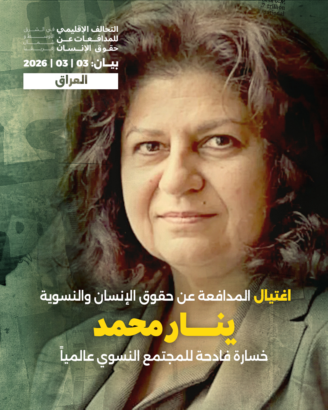 ينعى التحالف الإقليمي للمدافعات عن حقوق الإنسان في جنوب غرب آسيا وشمال أفريقيا (WHRDMENA) اغتيال المدافعة عن حقوق الإنسان النسوية المخضرمة الأستاذة ينار محمد، الحاصلة على الجائزة الفرنسية – الألمانية لحقوق الإنسان وسيادة القانون، ومُؤسسة منظمة حرية المرأة في العراق، على يد مسلحين يستقلون دراجات نارية خارج منزلها ببغداد يوم الإثنين الموافق 2 آذار \ مارس 2026.